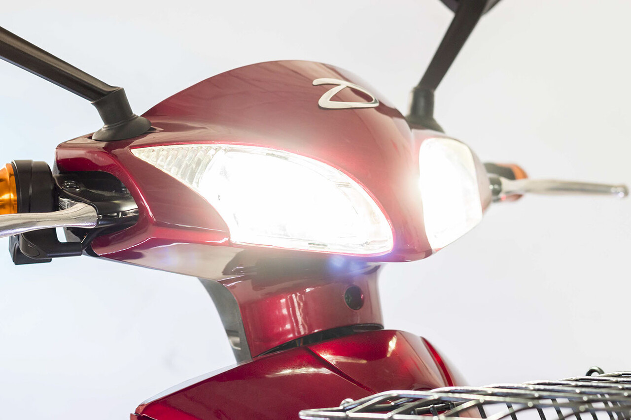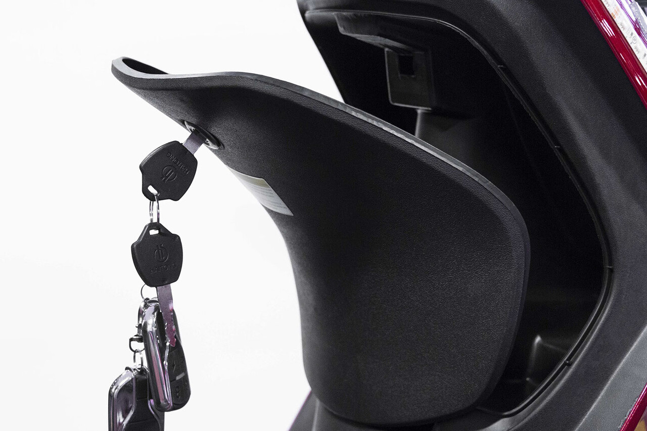A unique feature of the scooter are solar panels on the rear cargo box. The solar panels charge the scooter when it is parked to harness the power of the sun for free electric fuel.